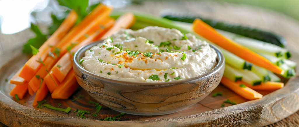 Crunchy and colorful veggie sticks served with hummus make for an engaging and nutritious snack. Slice up a variety of vegetables such as carrots, cucumbers, bell peppers, and celery, into “sticks”. Then pair them with a side of Hummus! Made from chickpeas, Hummus is a source of protein and fiber, and its creamy texture pairs well with the crispness of the vegetables.
