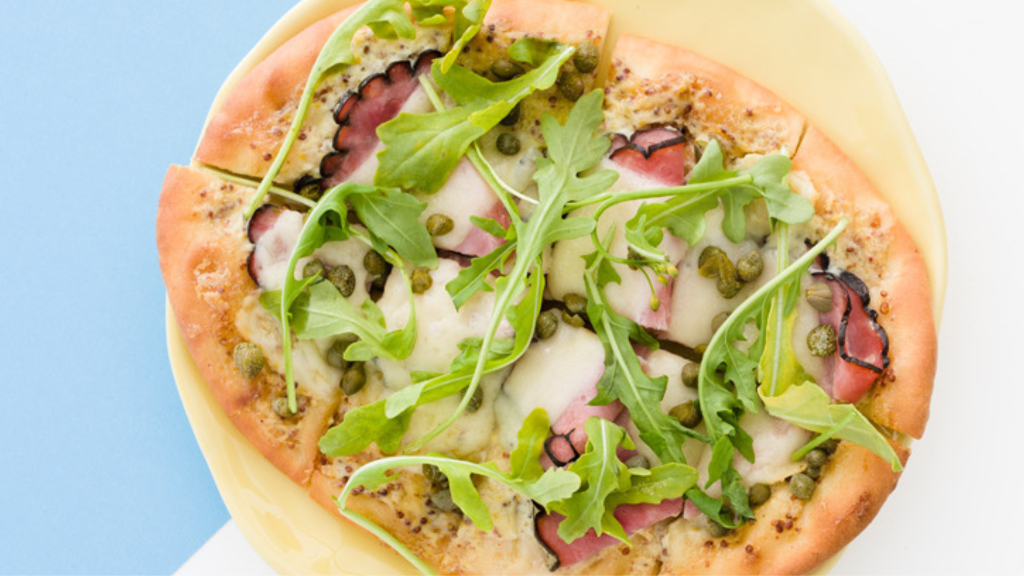 Top each naan with equal amounts of ham and cheese. Transfer the baking sheet to the preheated oven. Bake for 10 to 12 minutes or until the naan is golden brown around the edges. Remove from the oven and allow the naan pizzas to cool slightly. Sprinkle the pizzas evenly with capers and arugula. Cut each naan into six to eight pieces and serve warm.