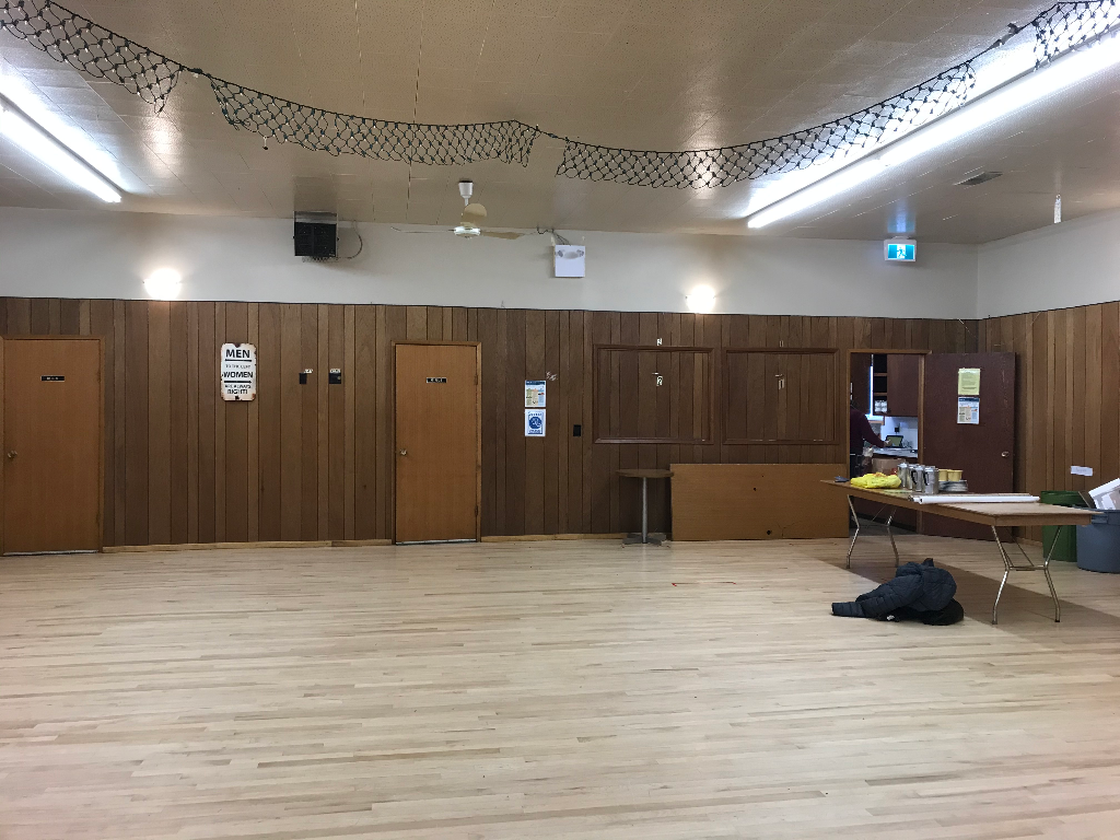 COVID-19 restrictions provided us the time to make changes for a brighter, more inviting place for our rental guests, as our hall sat vacant for many months. A group was organized and set to work on interior upgrades relying on community grants, donations, and give-aways. We applied for-and received-all the paint needed to prep and cover the original paneling from the Co-op Communities in Full Colour Paint Program.