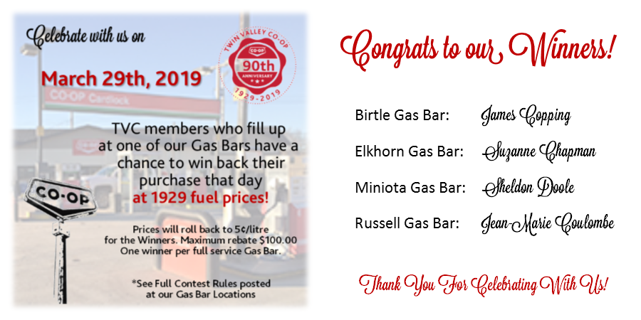 Congratulations to the winners of the March 29th 90th Anniversary Event at our Gas Bars!