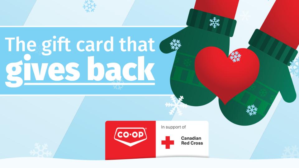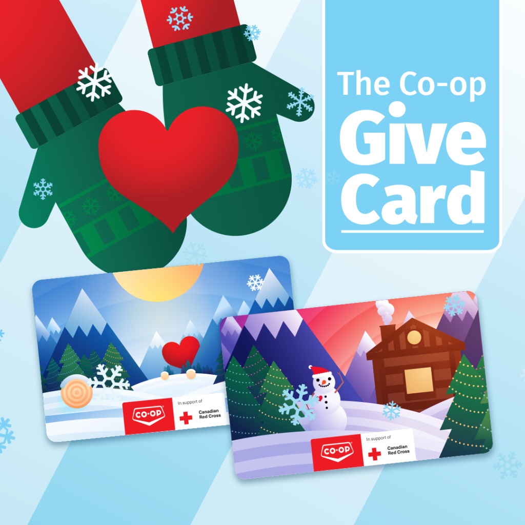 Purchase one of the holiday edition CO-OP® Gift Cards between Nov. 2 and Dec. 31, 2020, and help contribute to local emergency relief efforts by the Canadian Red Cross. Through the Co-op Give Card Campaign, Co-op will donate $1 from each holiday-inspired gift card sold this season.