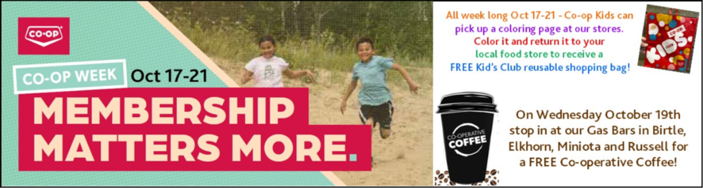 We have two promotions this Co-op Week Oct 17-21:- Kids Club kids can pick up a coloring page from any location, color it and return to their local Food Store. When they hand in their coloring page, they will receive a free Kid's Club reusable shopping bag. If you cannot make it in to the food store, e-mail your colored photo to: marketing@twinvalley.crs and we will reserve a bag for you :)