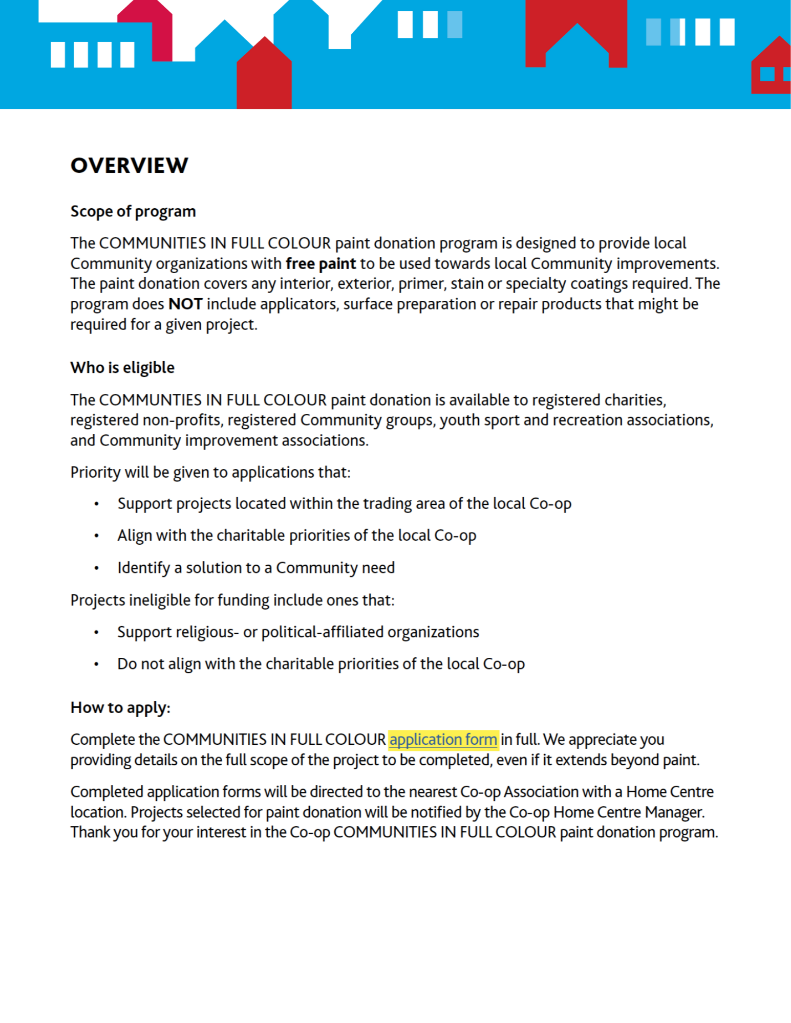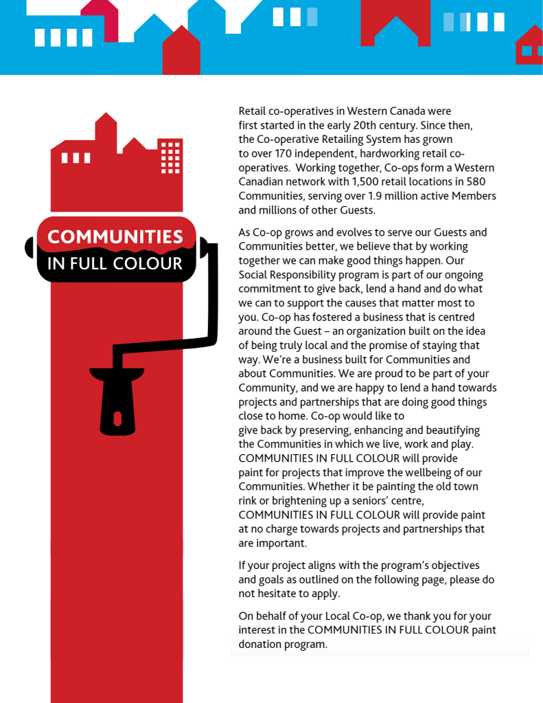 Communities in Full Colour is a Community-investment commitment that gives back to the places Co-op calls home. We are working to brighten up our Communities by donating CO-OPĀ® Imagine Paint to the projects and initiatives that matter most to you. For more details about the program, see the program overview below or stop by your Local Westview Co-op Home Centre.