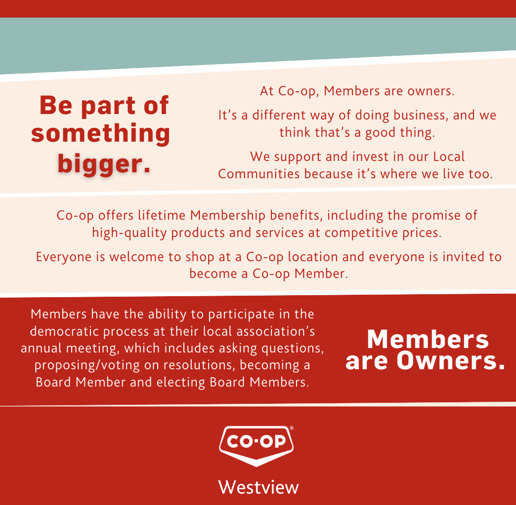 Visit one of our locations or co-op.crs/membership for more information about membership and its benefits.